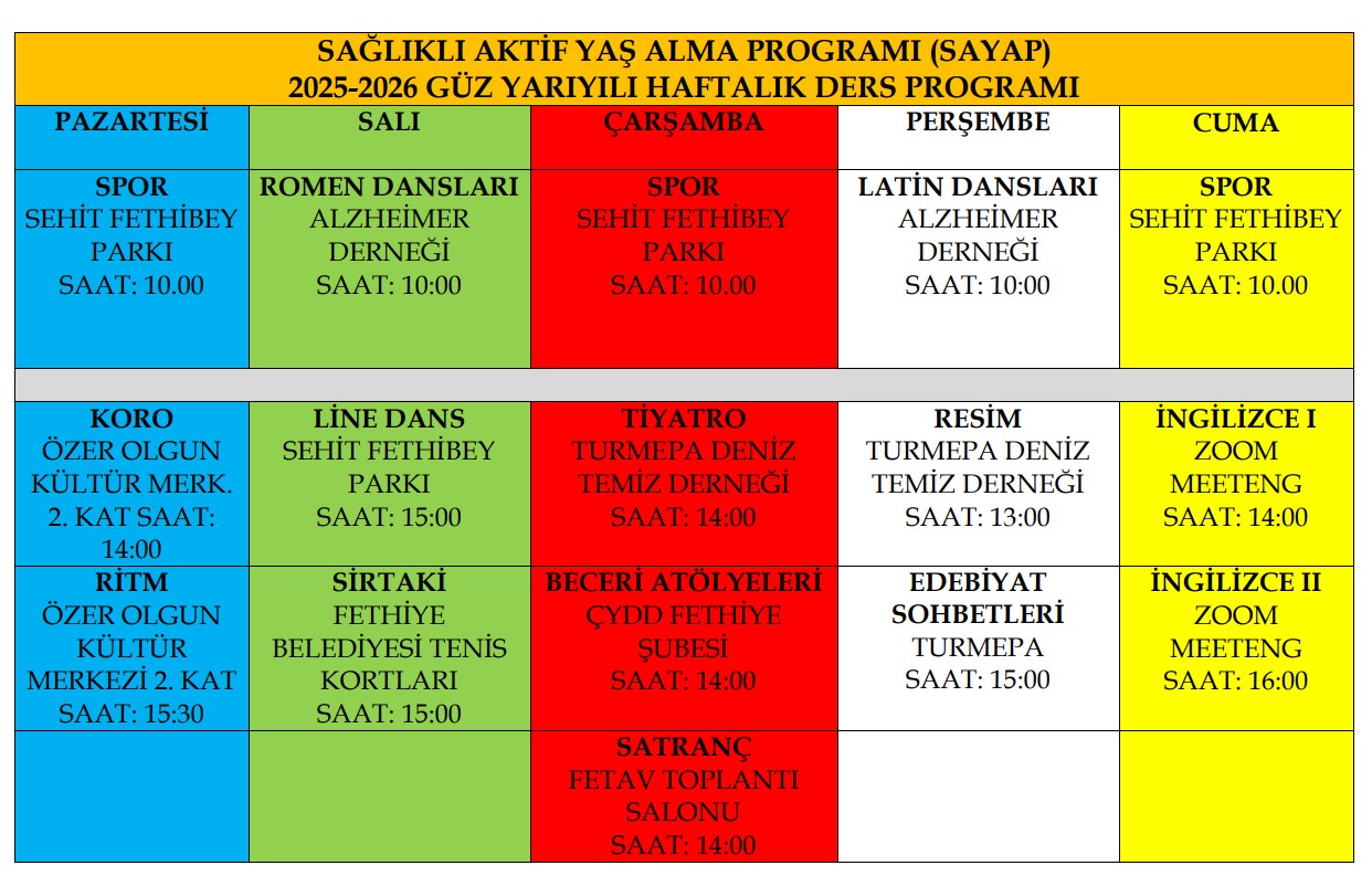 2025-2026 GÜZ YARILIYI MÜFREDAT VE DERS PROGRAMI Sağlıklı Aktif Yaş Alma Programı (SAYAP) 2025-2026 Eğitim Öğretim Yılı AKADEMİK TAHVİM Program Başlangıç 22 Eylül 2025 Program Bitiş 15 Mayıs 2026 Açılış Dersi 22 Eylül 2025 / FKM / Dr. Cemil YAVUZ Mezuniyet ve Başarı Belgeleri 17 Mayıs 2026 Kayıt esasları: En az 2 zorunlu (Spor, Konferanslar), 1 seçimlik 3 ders almalı Programın 1 yıl süren eğitimini ciddiyetle sürdürmeli, %70 devam zorunluluğuna uymalı 60 yaş üzeri olmalı Programı ve seçtiği derslerin faaliyetlerine engel sağlık sorunu olmamalı Program İçeriği: 2 zorunlu 10 seçmeli toplam 12 ders, 4 atölye çalışması Her ay bir sosyal program Her dönem 1 sosyal sorumluluk projesi Programa kayıt ve ders seçimi : 15-19 Eylül 2025 Saat: 13:30-15:30 FETAV Zorunlu Dersler: Spor (Taichi&CheGong&Yoga&Plates&Aerobik Egzersizler) Konferanslar, Seçmeli Dersler: İngilizce Koro -Ritim Satranç Beceri Geliştirme Line Dans Ege Dansları(Sirtaki) Romen Dansları Edebiyat Sohbetleri Resim Atölyeler: Drama atölyesi Beceri Atölyesi (takı tasarım, rölyef, epoksi vb.)